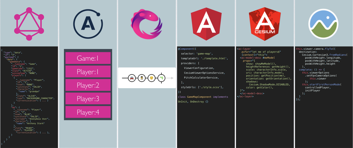 angular-apollo exposes the state as a Rx Observable which allowed us to plug that stream to our amazing angular-cesium framework and have the players magically move and update on a 3d scene rendered with CesiumJS!