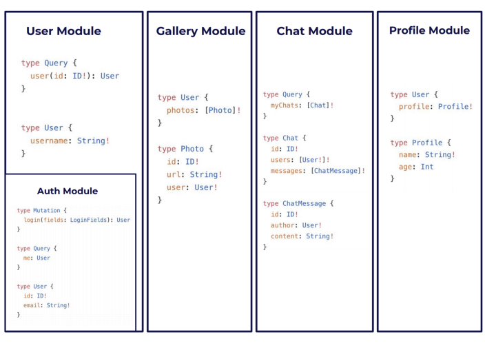 This way, each module can declare only the part of the schema that it contributes, and the complete schema is a representation of all merged type definitions. Module can also depend, import and extend and customize the contents on other modules (for example, User module, comes with Auth inside it)