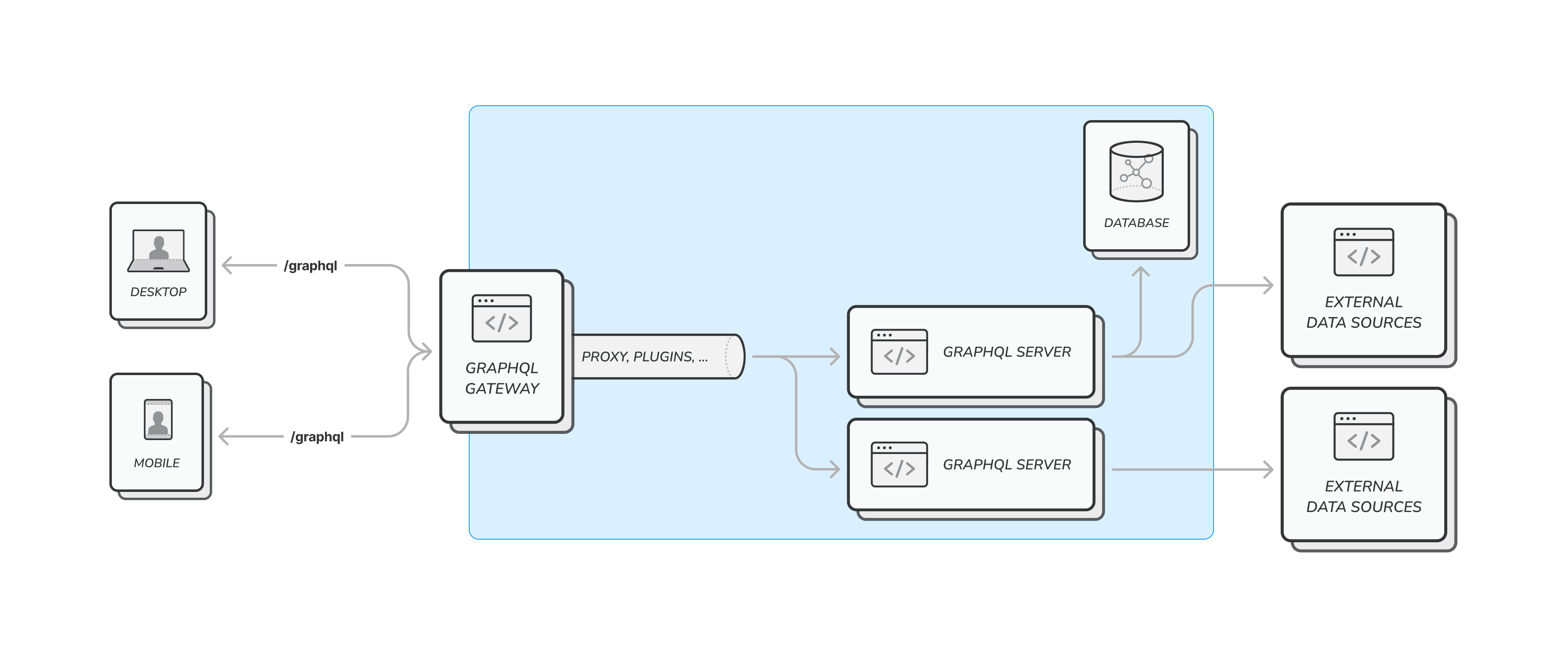 In the architecture chart above, the GraphQL gateway responsible for exposing your GraphQL server externally and adding capabilities to it. The GraphQL server, on the other hand, implements the actual GraphQL schema and runs resolvers, dataloaders, and any other custom code required for fetching and connecting your data or entities.
